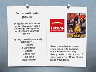 The author has decided not to choose Future Media or Bauer Media as their publishing company. Future Media already publishes many rock magazines, while Bauer Media publishes three of the top magazines including one focused on rock. Instead, the author chooses BCC because they do not currently publish a rock magazine and their other magazines are genre-specific like the author's proposed magazine.