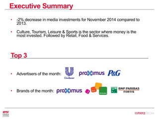 - Unilever remained the top advertiser, while Proximus jumped to second place with a 51% increase in investments compared to November 2013. Telecom, retail, and automotive sectors were the biggest investors overall.