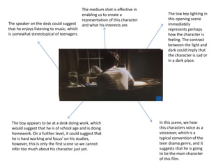 This document analyzes a trailer for a teen drama film. It summarizes each shot in the trailer, discussing things like characters, settings, lighting, color, and how they adhere to conventions of the genre. Overall, it infers that the trailer is about a lonely boy who is an outcast in high school, but finds friendship. The target audience is teens who will relate to the coming-of-age story and narrative of finding one's place. Analyzing the trailer will help the document's creator understand the genre and get inspiration for their own film.