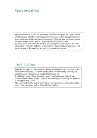 The document outlines plans for a local newspaper focused on sports but also including crime reports to show both positive and negative aspects of the youth community. The newspaper will have a tabloid layout to appear easy to read, feature sports and serious articles, and be free with funding from advertisements to attract readers and showcase the local youth area.