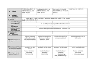 This document is a daily lesson log for a Grade 12 Media and Information Literacy class. Over four days, the lesson objectives progress from identifying traditional and new media to defining information literacy. On the first day, learners are expected to identify and discuss the characteristics of traditional and new media. The second day focuses on technological and cultural determinism and searching theories of information and media. The third day covers normative press theories and evaluating media in the Philippines. Finally, the fourth day defines information literacy and its components. Learning resources include textbooks, presentations, and online videos. Assessment includes activities analyzing cartoons, media types, and information literacy. The teacher reflects on teaching strategies, difficulties, and innovations.