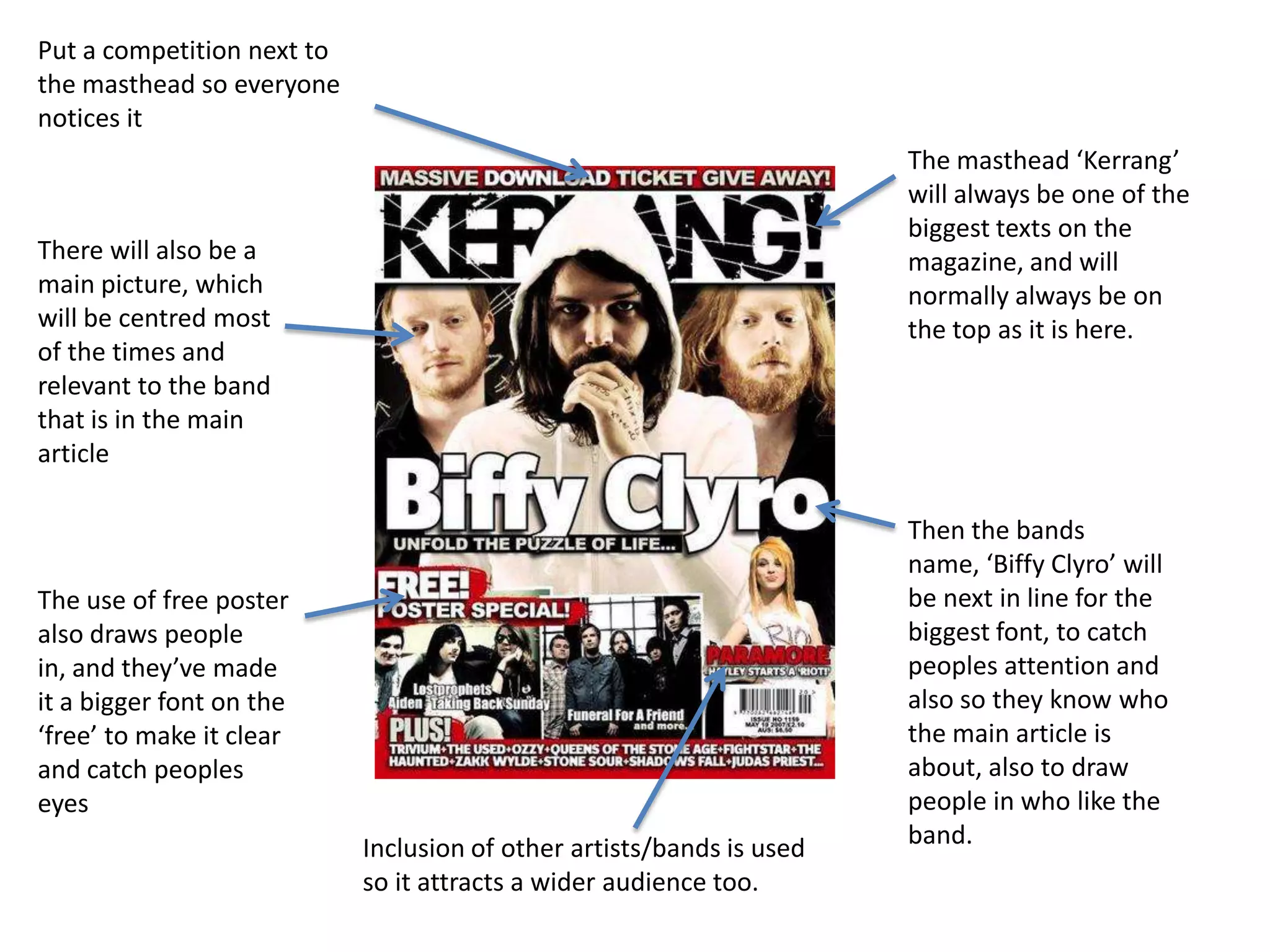 1) The masthead is always one of the largest texts on the cover page to identify the magazine. The featured band's name is also in a large font below to indicate the main article.