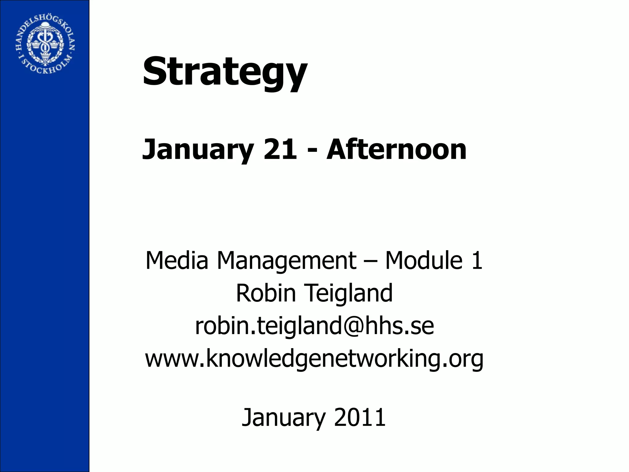 The document outlines a comprehensive strategy course led by Robin Teigland, covering various aspects of strategic management including external and internal analyses, competitive advantage, and industry structure. Key topics include Porter's Five Forces, the resource-based view, and strategic frameworks applicable to organizations within the gaming and virtual worlds sector. Assignments include case studies, group projects, and the development of strategy statements for selected organizations.