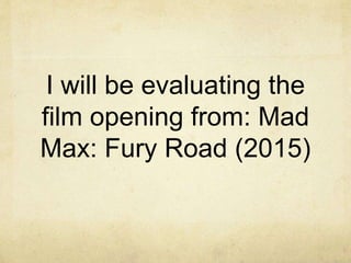 The document provides a detailed shot-by-shot analysis of the opening scene from the film Mad Max: Fury Road. It examines the different camera shots used, including extreme long shots, tilts, medium close ups, close ups, and action close ups. It describes how each shot is used to set the scene in the desert, establish Max as the main character, show him eating a lizard, begin an action sequence as vehicles chase him, and get out of his wrecked vehicle. The analysis concludes by noting the repetitive pattern of shots and evaluating resources used to understand cinematic techniques.