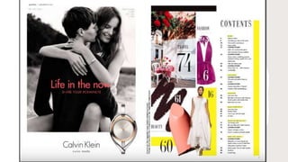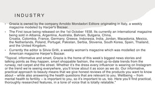 Grazia is an international weekly women's magazine owned by Arnoldo Mondadori Editore and first published in Italy in 1938. It is targeted towards affluent women aged 25-45 and covers topics like fashion, beauty, celebrity news, and lifestyle. The magazine's website reinforces its brand and values through easy navigation, hyperlinks to key sections, and advertisements from brands like Victoria's Secret that also target women. It aims to engage readers through a pop-up subscription offer and provide relatable content across various subcategories.