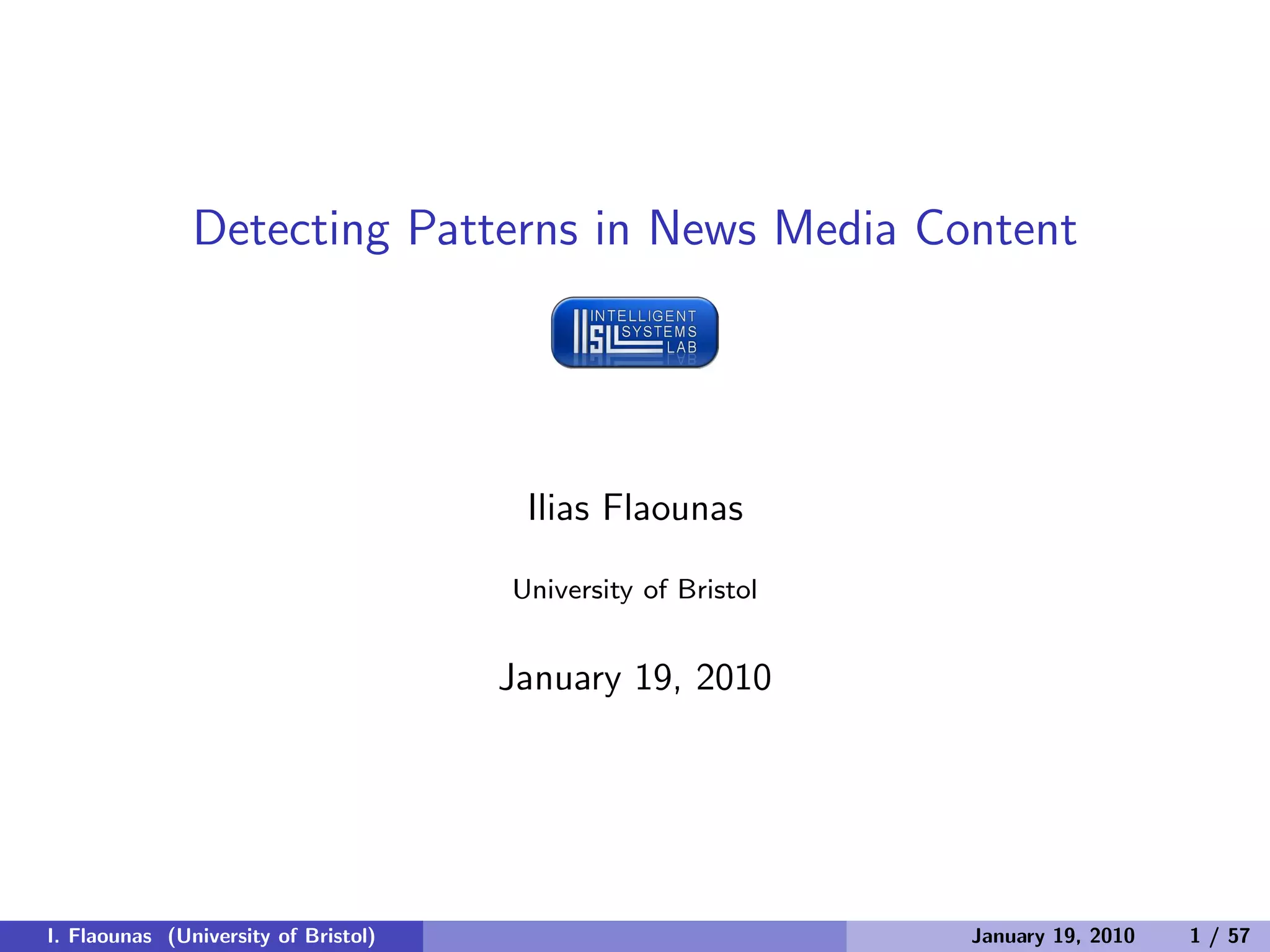 The document discusses detecting patterns in news media content through automated analysis. It describes building a corpus of over 30 million news items from more than 1,300 global media sources and applying techniques like machine learning, natural language processing and statistical machine translation to analyze the data at scale. The goal is to answer previously intractable questions about the global mediasphere and media systems.