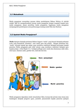 Bab ini membahas media pengajaran dalam konteks pembelajaran bahasa Melayu, meliputi definisi, jenis, dan pentingnya media dalam pendidikan. Ia menekankan pemilihan media berdasarkan objektif pelajaran dan gaya pembelajaran murid, serta memperkenalkan konsep-konsep seperti model Dale dan Shulman untuk mengoptimalkan penggunaan media dalam proses pengajaran. Media pengajaran tidak hanya berfungsi sebagai alat, tetapi juga sebagai perantara yang membantu menyampaikan maklumat dari guru kepada pelajar dengan lebih efektif.