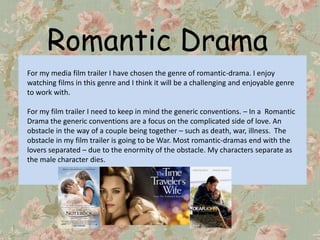 The document outlines Laura Mayall's plans for her media film trailer project on the genre of romantic drama. Some key details include: