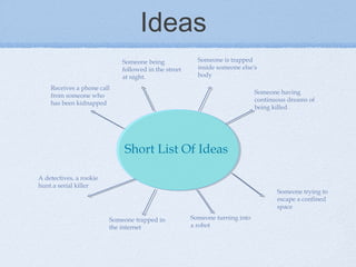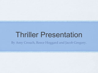 The document outlines plans for a student thriller presentation including ideas, characters, locations, costumes, props, schedules and storyboards. Some key details: the narrative involves a victim being kidnapped, bound and locked in an isolated shed where the antagonist will return to torture them. Jacob will play the villain while Amy portrays the vulnerable victim. Filming of key scenes will take place at the school drama shed over two afternoons.