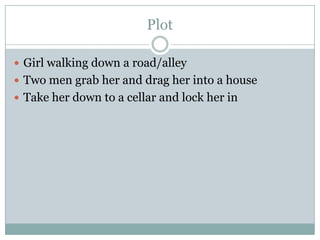 Two men kidnap a girl walking alone and lock her in a damp, neglected cellar. The filmmakers chose this location because it resembles the settings in thrillers they analyzed. They decided to include a female victim kidnapped by men, drawing from The Silence of the Lambs, even though kidnapping was not present in the films they studied, to make their storyline easier to film.