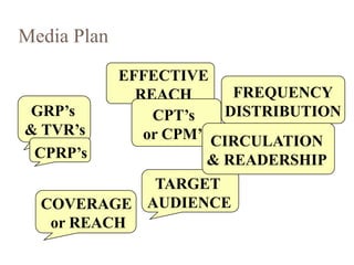 This document provides an overview of media planning concepts, including key terms like target audience, reach, frequency, GRPs (Gross Rating Points), and CPT (Cost Per Thousand). It discusses various media metrics such as television ratings, press readership, and calculated audience exposure, while explaining their importance in achieving advertising effectiveness. Additionally, it includes practical examples and calculations to demonstrate how to evaluate and optimize media strategies.