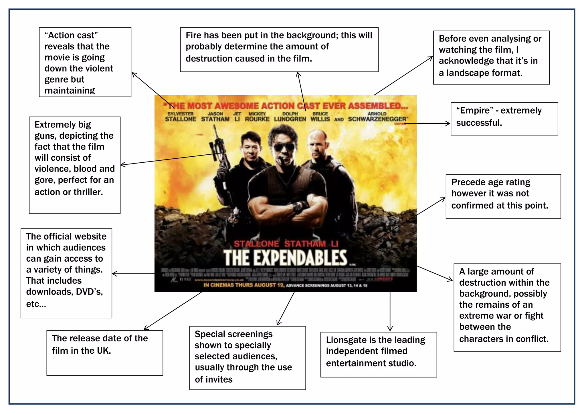 The document discusses an upcoming action/thriller film, noting that fire has been placed in the background to determine the level of destruction, the film will likely include extreme violence depicted through big guns and blood/gore, and that the official website provides access to downloads, DVDs, and special early screenings for select audiences. The film studio Lionsgate is distributing the independent action movie.