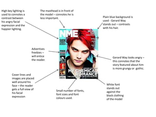 This document analyzes the visual elements of various magazine covers, noting how design choices like fonts, lighting, positioning of images and text convey information about the music genre and personalities featured. Elements like retro fonts, pictures of other bands and quotes help indicate the type of music covered in the magazine. Facial expressions, lighting and composition of band images provide cues about their mood and the tone of accompanying articles. Consistent, limited design choices like fonts and colors aim to look professional.