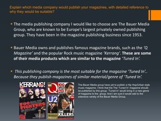 The media company that would be most suitable to distribute the "Tuned In" magazine is Bauer Media Group. Bauer Media Group is Europe's largest privately owned publishing group, having been in business since 1953. They own and publish magazines similar to "Tuned In", such as "Q Magazine" and "Kerrang", focused on rock music. Bauer Media Group has not published a hip hop/urban style music magazine before, so "Tuned In" would bring a new genre to the group and add to their variety. Choosing Bauer Media Group would provide advantages for advertising "Tuned In" across their radio, television, and digital media platforms.