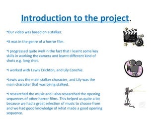 The student created a horror film project with two classmates about a stalker. They received feedback that the music did not fit well and they rushed parts of the project. The student learned new filming and editing skills through making the project but feels they could have improved it with more organization and effort.
