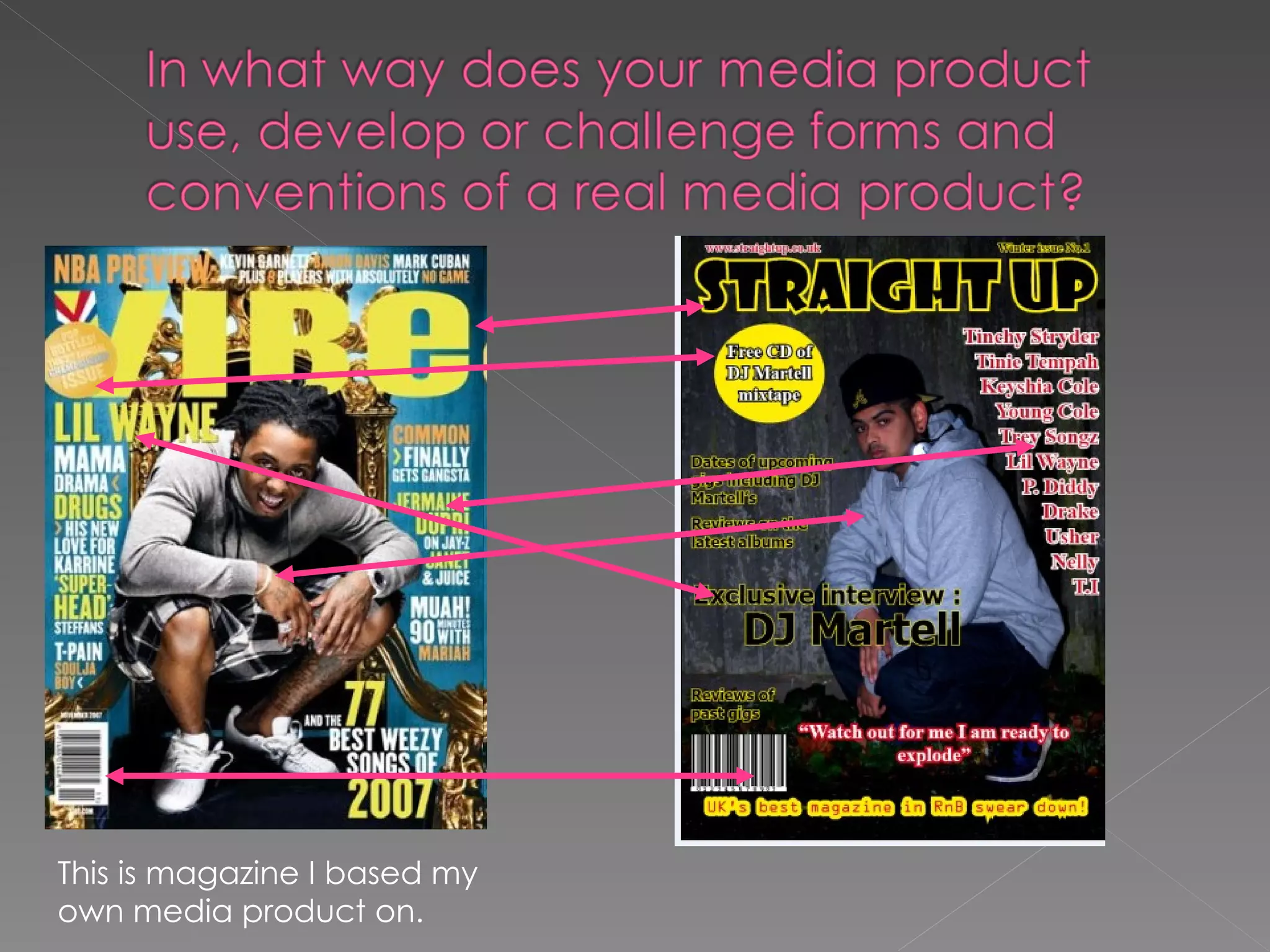 The document describes a magazine the author created to conform to conventions of real music magazines. It includes a glossy front cover with an image of the featured artist to attract audiences. The front cover also displays the magazine title, pull quotes, and a listing of what's included inside. The magazine uses conventions like advertisements, a contents page, and a double-page spread layout including a full-page artist image and interview. It aims to represent and attract a young, 16-21 age group through language, featured artists, and topics like upcoming parties and popular dances. The author learned skills in using programs like Photoshop and InDesign to lay out the magazine professionally.