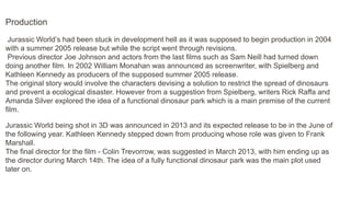 1) Jurassic World took over 10 years to enter production and went through many directors, writers and cast changes before Colin Trevorrow was selected as director in 2013.