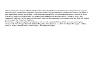 The document provides details about a media presentation by Naomi Clarke. It discusses various tasks Naomi will complete during a study, including evaluating existing school magazines and creating her own school magazine. The intentions are for Naomi to create a high quality product that requires little correction and is suitable for schools.