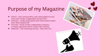 The document outlines a pitch for a romance film magazine aimed at women aged 12-35, focusing on new romance films and promoting the North London film industry. It will include reader participation through fan fiction, interviews, and film synopses, with both print and online formats priced at £4 per issue. Marketing strategies emphasize local engagement through social media and community events, targeting a loyal and diverse audience.