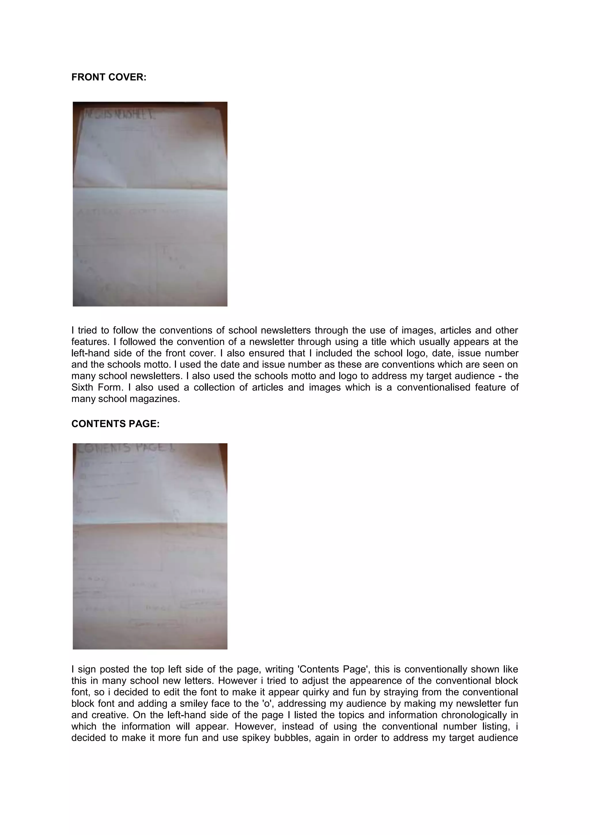 The document describes the design and layout of a school newsletter created to follow conventions of the genre while appealing to a target audience of sixth form students. Key elements included a title, date, issue number, school logo and motto on the front cover. The contents page listed topics in a quirky, fun font with smiley faces and bubble numbers. A double page spread included related articles and images to engage the target audience. The creator aimed to balance conventions with unconventional, creative elements to appeal to sixth form readers.