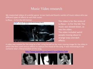 The document discusses research done for a music video project, including analyzing other music videos, conducting audience surveys, and researching artists. It outlines the group's final idea for their music video, which will be a gloomy interpretation of the song suited to its mood. They have chosen locations like a stage and subway to create a sense of feeling trapped. Props and lighting will be used symbolically without being too literal.