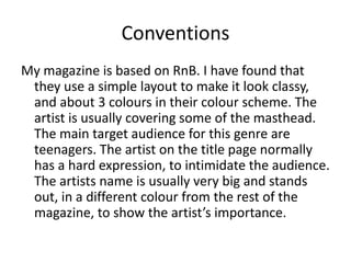 This document provides details on designing an R&B music magazine, including conventions, market research, a reader profile, and layout designs for the front cover, contents page, and a double page spread. Key elements include using 3 colors in the design, featuring artists prominently on the cover and masthead, including interviews, fashion, and relationships in articles, and targeting 16-17 year old fans of R&B and hip hop artists.