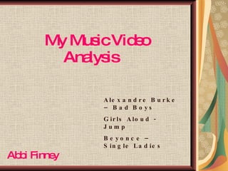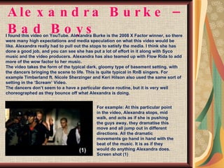1) Alexandra Burke's "Bad Boys" video features Burke lip syncing and dancing with back-up dancers in a dark basement setting, with a cameo from Flo Rida.