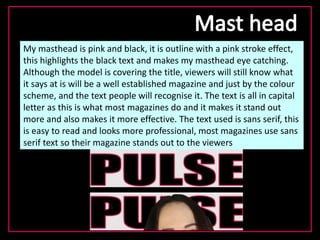 This document summarizes how the media product uses and develops conventions of real magazines. It discusses using a pink and black color scheme on the masthead to make it eye-catching. Professional photos were taken in a studio to look like real magazines. Techniques like pull quotes and cover lines were used to engage readers. A consistent sans-serif font and house style made the magazine look professional. The double page spread followed conventions like taking up a full page with a photo and columns of text. The images, layout, and techniques develop magazine conventions to create a realistic looking media product.