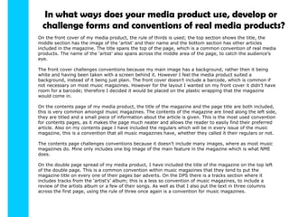 The document describes the key design elements and conventions used in the student's media product, a music magazine. On the front cover, the title spans the top using the rule of thirds, and the artist's name spans the middle. The contents page includes the magazine title, article titles and descriptions lined on the left. The double page spread features the magazine title on the top left and includes album tracks reviews across three columns.