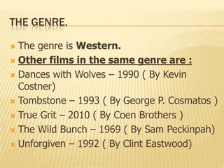 This document analyzes the Western genre and the 2012 film Django Unchained. It discusses conventions of the genre like climactic shootouts and the "lone cowboy." It also examines how people, places, and objects are represented in the Django Unchained trailer, including the stereotypical portrayal of African Americans and women. The purpose of the Western genre is outlined as portraying life in the American Old West during the late 19th century.