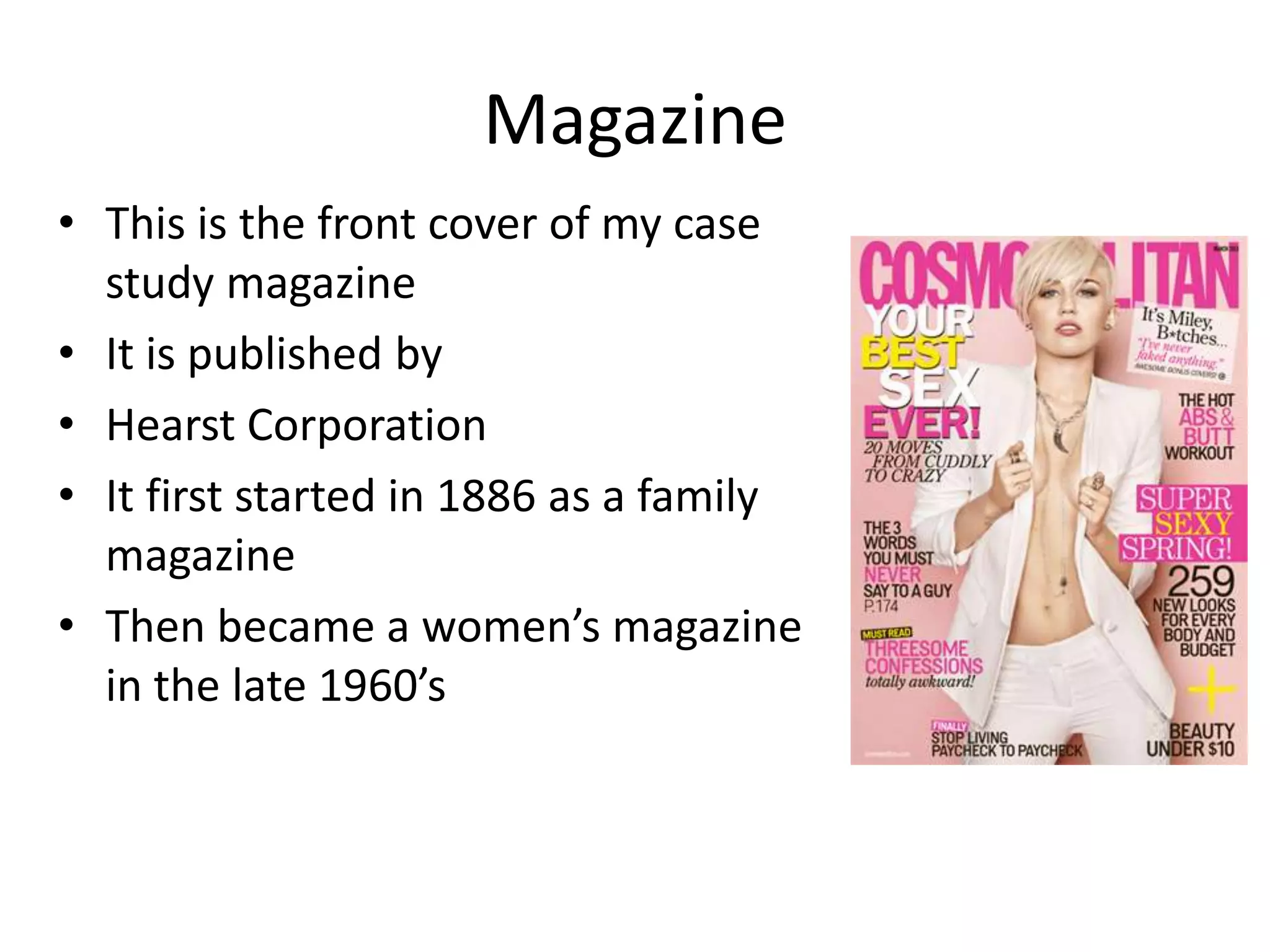 This document provides an overview of a presentation on a case study magazine. It includes details about the magazine such as its name, publisher, year founded, and past changes. It also discusses the magazine's history, including how its style changed over time from a family magazine to focusing on women. Additional sections cover the magazine's main rival, publisher, ownership, audience, and how the magazine has evolved online. The document concludes with notes on theories related to the future of magazines, including synergies between companies and the impacts of web technologies.