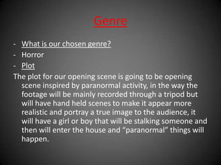 This document discusses the plans for an opening scene for a horror genre media project. It will be filmed in an ordinary house to increase realism. The plot involves someone stalking and entering a house where paranormal things will happen, inspired by Paranormal Activity. Test shots will be taken of the potential house location and rooms, lighting, and props to ensure they are effective for the horror genre. Specific shot locations like the bathroom or bedroom will be decided later.