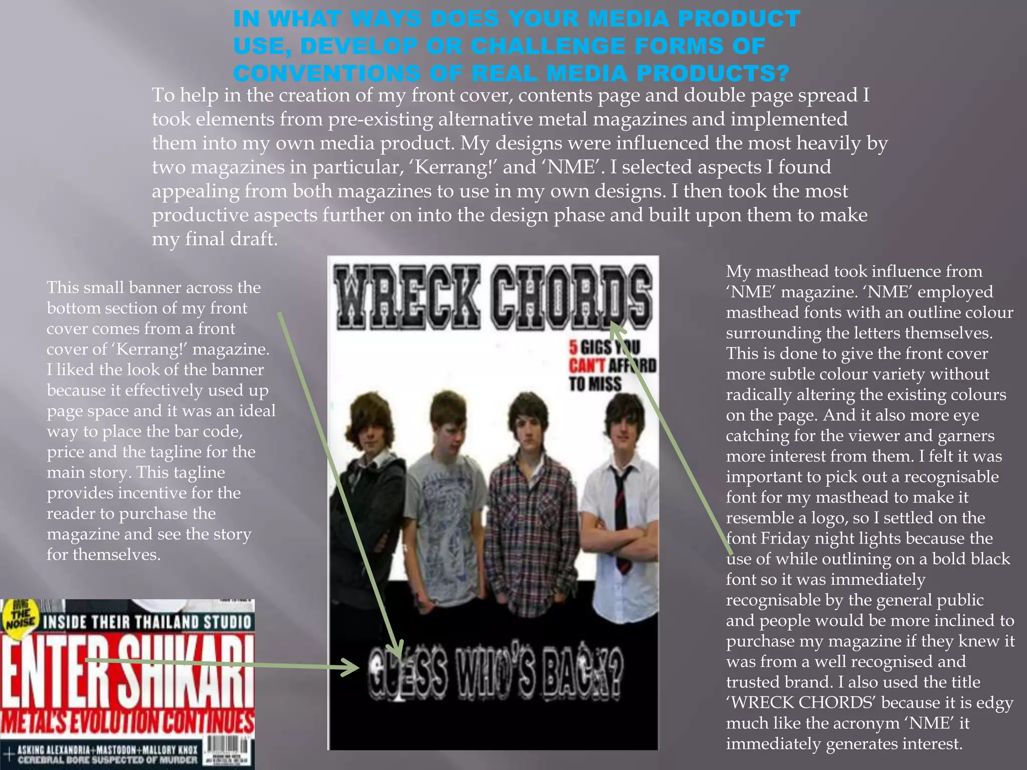 The student used their preliminary work to learn important lessons about planning, design, and software skills for their media product. They realized the importance of proper time management and referencing real magazines. While their early drafts were quick, the final product required more effort and attention to detail. The student feels they improved at using Macromedia Fireworks over the course of the project. Posting images on Facebook allowed the student to gain peer feedback, demonstrating how multimedia enhances media products.