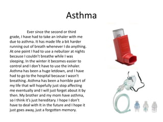 The document describes the author's experiences with asthma over many years, noting that it makes breathing difficult and has required frequent use of an inhaler as well as hospital visits. The author expresses a hope that the asthma will eventually stop affecting them. It is mentioned that the author's mother and brother also have asthma, suggesting it may be hereditary.