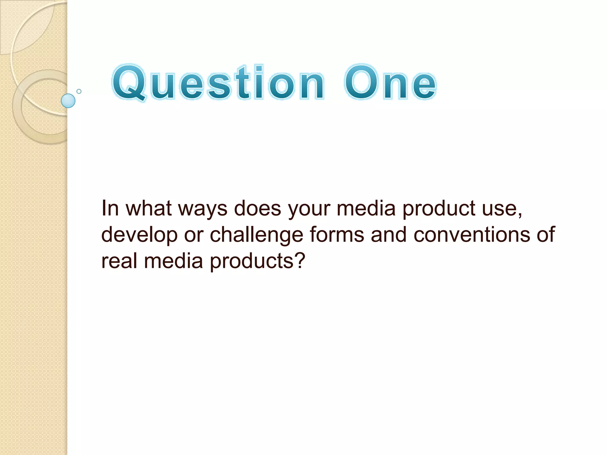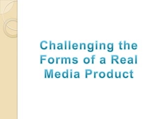 The document discusses how the media product challenges conventions of real indie magazines. Research was conducted on target markets and magazine formats. The front cover uses a unique masthead design and black and white photo. The contents page is inspired by Q Magazine's layout. Double page spreads use a vintage style and acoustic guitar images to reinforce the indie feel. Color schemes, photo editing, and social media integration are used to engage audiences and feel professionally indie.