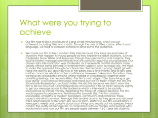 The document discusses the goals and inspirations behind a student film project. The film aimed to tell a modern fairy tale with a moral message, drawing inspiration from Cinderella but with an unexpected tragic ending. It was intended for teenage audiences to provide knowledge about common teenage experiences and satisfy curiosity. The filmmakers aimed to appeal to outsider teenagers and send a message about being true to oneself. Ancillary materials like the poster and radio trailer were designed to intrigue audiences without revealing too much of the plot. Comparisons were made to other fairy tales and Richard Dyer's Utopian theory of entertainment was considered in targeting the film to teenagers.