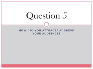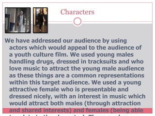 The document summarizes how the filmmakers attracted and addressed their target youth audience. They used characters like young males involved with drugs, music, and fashion that youth would identify with. A young attractive female interested in music would appeal to both male and female viewers. The plot about gang life, music, romance, and teenage problems mirrors typical experiences for the target age group. The urban and suburban school and music studio locations also aim to resonate with teenage audiences. Special effects like blurred scenes intrigue viewers and foreshadow future disruption in the film.