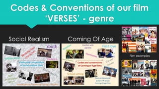 This document discusses the genres, codes, and conventions used in the media product "VERSES". It examines how the film draws from the genres of social realism and coming-of-age films through its focus on working class characters and themes of growing up. While the teaser trailer follows many conventions like using unknown actors and montage editing, it challenges some conventions by omitting a voiceover and focusing less on sex, drugs, and rebellion typical of the genres. The target audience is identified as males and females aged 16-24 who can relate to the teenage protagonist navigating career decisions.