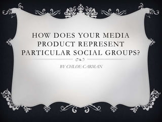 This document discusses how a media product represents social groups through its locations, lighting, scheduling, props, sounds, and characters. It summarizes how the film noir-inspired opening sequence uses mysterious outdoor locations, traditional props, and a female lead to appeal to both traditional older audiences and younger audiences seeking adventure. While containing mature themes that require an older audience, the use of natural lighting, modern twists on music, and an intriguing narrative encourage broader appeal. Framing, pans, and classic transitions aim to engage audiences familiar with older crime dramas while still providing clues and questions to intrigue newer viewers.