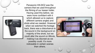 The document discusses the use of various new media technologies in planning, filming, and promoting a student film project. It describes using an online blog to document the process and share media like photos and videos. PowerPoint was used to share ideas and pitch the film visually. iMovie was used to edit the teaser trailer, and Photoshop was used to create the film poster and magazine cover. YouTube was researched for trailer conventions and used to upload and promote the finished products. Overall new media technologies played a key role in each stage of the project and helped engage their target teenage audience.