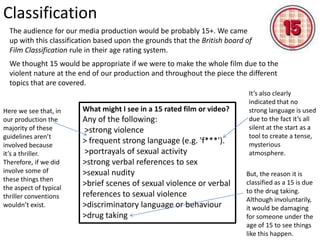 This document discusses classifying the target audience for a media production. It determines that a 15+ rating would be appropriate due to violent content and drug use shown. The intended audience is identified as primarily male, between 15-25 years old, interested in typical male hobbies like video games, music, socializing with friends. This demographic enjoys thrillers and horror genres and explicit content allowed in 15 rated films.