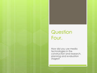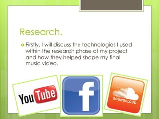 The document discusses the various media technologies used during the construction, research, planning and evaluation of a music video project. YouTube, Google, Facebook, Blogger, SoundCloud, TimeToast, iPhone calendar, Premiere Pro, Photoshop, a Nikon camera, lighting equipment, and a Panasonic video camera were used during the research and construction stages. YouTube, YouTube, PowToon, and video were utilized during the evaluation to gather audience feedback and create a director's commentary. The technologies helped with brainstorming ideas, gathering information, planning schedules, editing footage, designing promotional materials, and presenting the final evaluation.