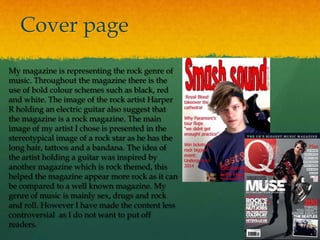 The document discusses how a magazine represents the rock music genre. It uses bold colors like black, red, and white throughout. The cover image features a rock artist holding an electric guitar, portraying the stereotypical image of a rock star. The contents page also aims to represent rock music with a bright red background and mentions of rock artists. The article profiles an artist named Harper Redman and aims to portray him as down to earth rather than a typical rock star through the questions asked and quotes chosen, as well as showing him practicing in his bedroom to seem hard working and casual.
