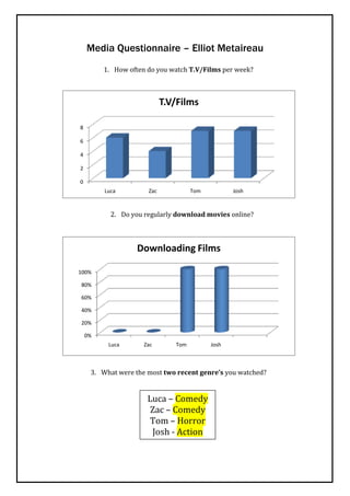 The document is a media questionnaire that was completed by 4 individuals - Luca, Zac, Tom, and Josh. It shows that Luca and Zac watch the most TV/films per week at 8 hours, while Tom watches 6 hours and Josh watches 4 hours. It also indicates that only Luca does not regularly download movies online. Finally, it reveals that the most recent genres watched were comedy by Luca and Zac, horror by Tom, and action by Josh.