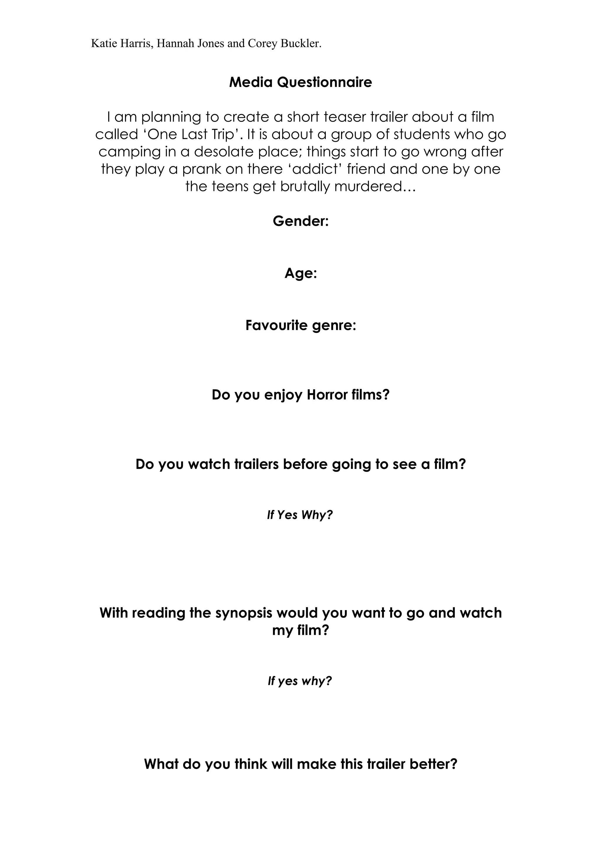 The document is a media questionnaire about a short teaser trailer for a horror film called "One Last Trip." The film is about a group of college students who go camping in a desolate place and start being brutally murdered after playing a prank on their addict friend. The questionnaire asks for the respondent's gender, age, favorite genre, if they like horror films, if they watch trailers before movies, and their thoughts on the film synopsis and how to improve the trailer.