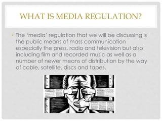 Media regulation refers to the public means of mass communication like press, radio, television, film and recorded music. It came about during the 1980s due to public complaints about excesses in the British press. Almost everyone relies on the media to learn news and hear debates, so it plays a central role in freedom of information, though governments sometimes want to limit critical voices. There is debate around whether regulation protects the public or "toffs," and whether the government will use the Leveson Inquiry as an opportunity to reset its relationship with the media and establish new robust regulations.