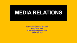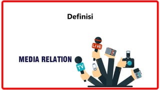Dokumen tersebut membahas tentang media relations, yang didefinisikan sebagai hubungan dua arah antara organisasi dengan media massa. Dokumen menjelaskan berbagai aspek terkait media relations mulai dari definisi, jenis media, fungsi media, teknik penulisan press release, hingga kegiatan yang dapat dilakukan untuk menjalin hubungan dengan media seperti konferensi pers dan kunjungan ke kantor berita.