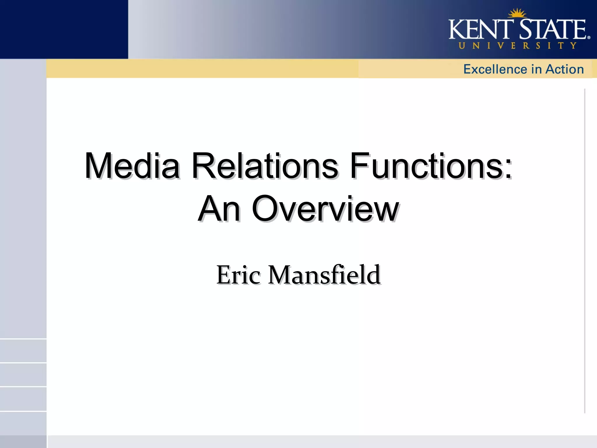 The document outlines the main functions of media relations, which include pitching stories to media, building relationships with reporters, fulfilling information requests, advising leadership, monitoring media coverage, crisis communications planning, and implementing publicity initiatives. It also provides tips for media relations professionals such as reading industry media, researching outlets, using online tools to track coverage, consistently building relationships with journalists, and communicating with internal management. The overall functions and goals of media relations are to gain positive coverage and visibility for an organization through proactive outreach and being a resource to reporters.