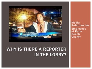 This document provides guidance and best practices for county employees interacting with the media. It discusses the importance of maintaining good media relations to communicate with the public about county services and issues. Some key points covered include establishing honest and open partnerships with the media, following county media relations policies, and being prepared when speaking to reporters by having clear key messages and answering questions directly. The document also provides tips for writing news releases, conducting interviews, and correcting any inaccuracies reported by the media. The overall message is that county employees should be responsive, transparent and truthful in their interactions with reporters in order to convey an accurate and positive image of the county government.