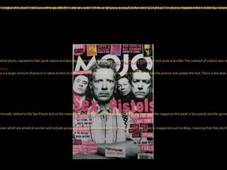 The document analyzes the design elements of several music magazine covers and contents pages, including color schemes, photography, writing styles, layouts, ratios of text to images, and fonts. Key points analyzed include how the design represents the bands featured and aims to appeal to the magazines' target audiences and genres of music. Overall the document provides detailed breakdowns of the visual rhetorical strategies used across different magazine covers and pages.
